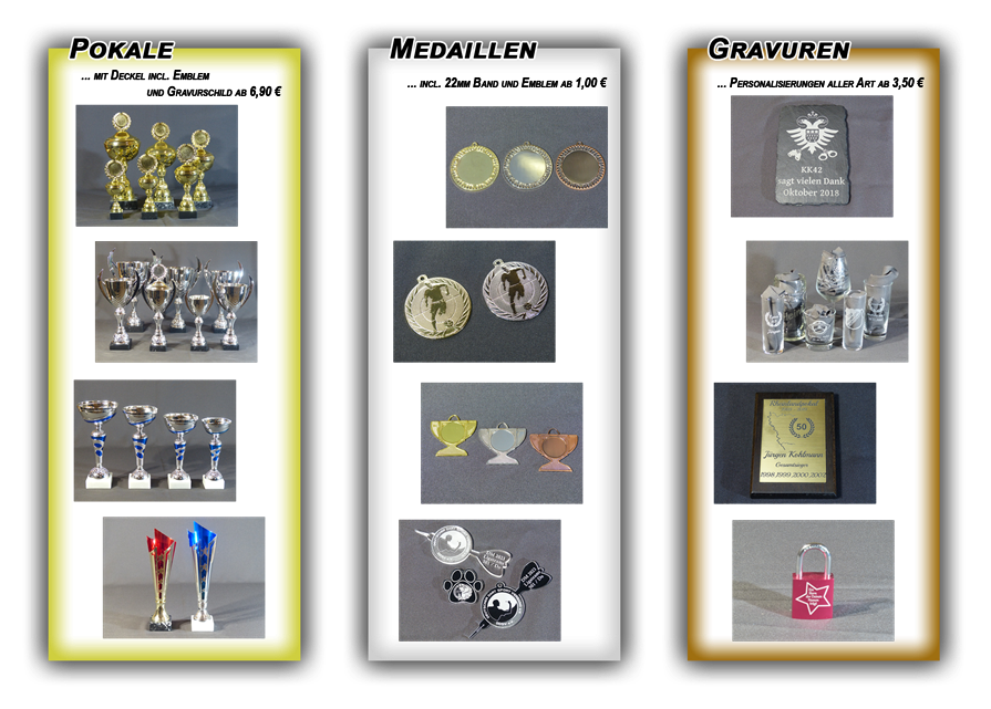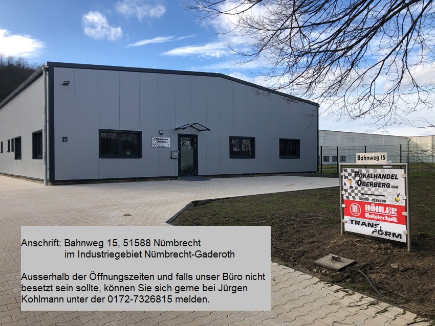 Zum Jahresbeginn 2016 haben wir, Jürgen Kohlmann und Ralf Steinbrügge, den Pokalhandel Herrmann aus Wiehl übernommen und führen ihn als Pokalhandel Oberberg in neuen Räumlichkeiten weiter. Vielfalt, Flexibilität und Kompetenz in allen Bereichen rund um den Pokalhandel summieren sich in unserem neuen Standort am Bahnweg 15 in Nümbrecht-Gaderoth.